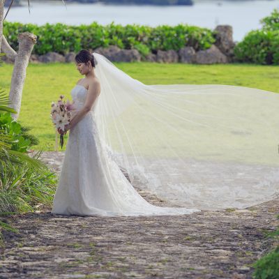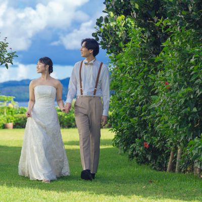 チャペル周辺のガーデンには、沖縄の雰囲気を引き立てるヤシの木や石畳の小道が。お散歩しているシーンの撮影にぴったりです。