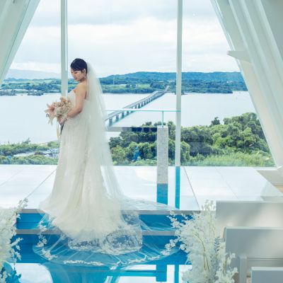 そんな非日常の絶景、エメラルドグリーンの海に囲まれた白亜のチャペルで